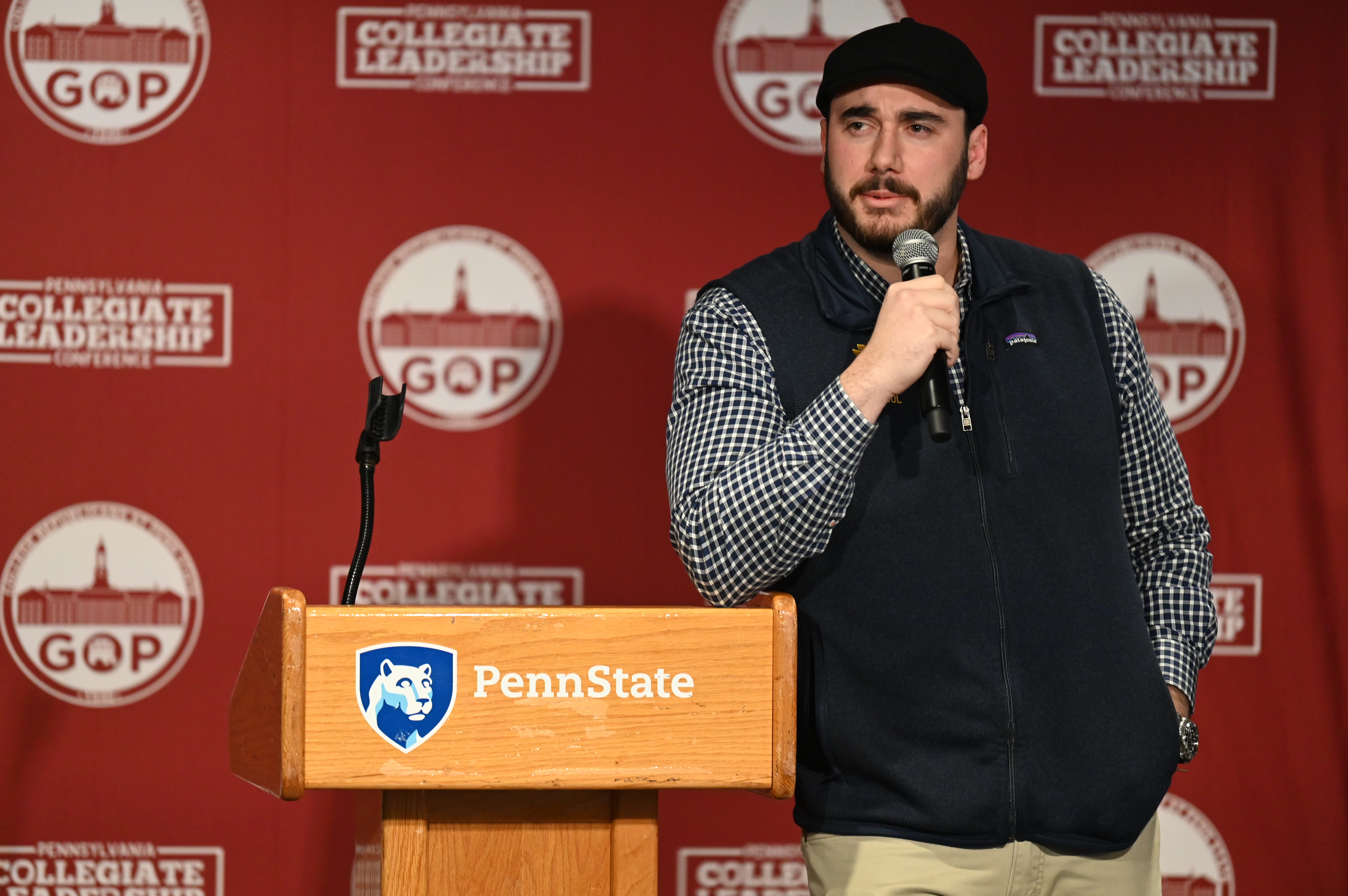 Chairman of the College Republicans of America Will Donahue speaks on stage at the third annual Pennsylvania Collegiate Leadership Conference, Jan. 16, 2026, in University Park, Pa. Courtesy of Hunter Steach